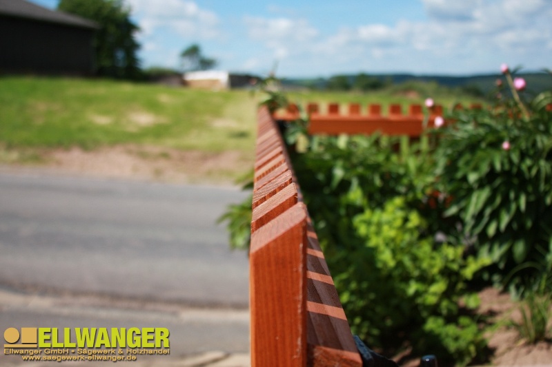Die Douglasie-Stacheten wurden auf 35mm x 55mm x 530mm gehobelt/gefast, danach per Kreissägenschnitt sauber angespitzt, und anschließend auf die Rhombus-Unterkonstruktion aufgeschraubt. Auch hier wurde vorher alles mit TEOMA-Holzschutzöl behandelt
